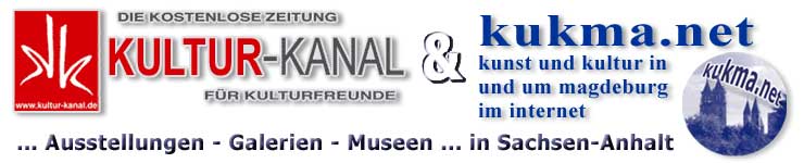 Das Kulturportal kukma.net versteht sich als Landesbüro Sachsen-Anhalt des KULTUR-KANAL, der kostenlosen Zeitung für Kulturfreunde, die seit Herbst 2004 auch online zur Verfügung steht. Newsletter, Presseinformationen etc. zu Ausstellungen, Vernissagen etc. sind erbeten. Bei Interesse finden sich HIER weiterführende Informationen und die Möglichkeit zum direkten Kontakt zu kontakt@kukma.net (Hans-Peter Lippert, Magdeburg)