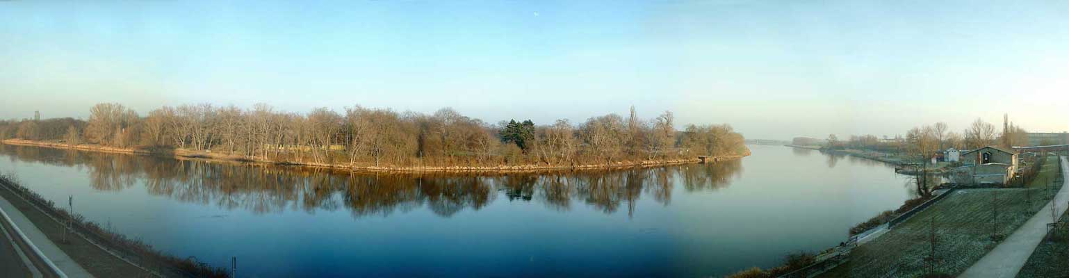 Magdeburg - Blick auf den Kulturpark (Elbinsel Rotehorn, links der Aussichtsturm des Stadthallen-Ensembles), die winterliche Elbe und die Buckauer Fähranlegestellen mit der Gaststätte "Mückenwirt" (Jan. '06 von der Elbstraße)